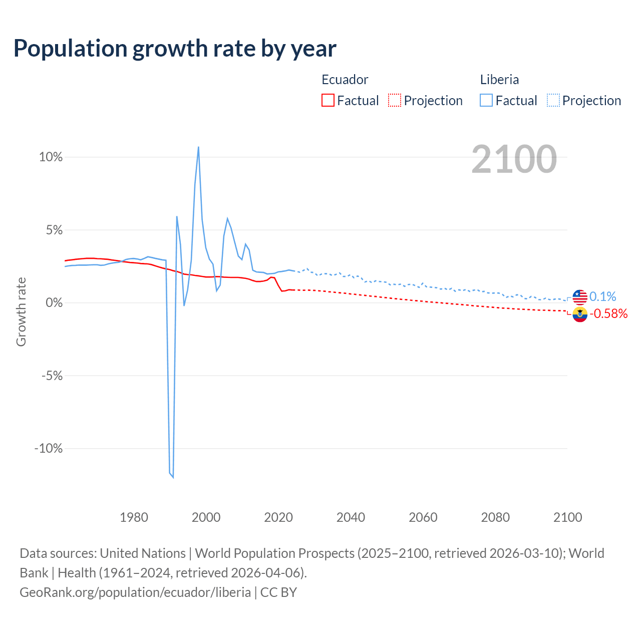 - For the last 10 years, Ecuador has had an average growth rate of +1.26% per year vs +2.09% in Liberia.