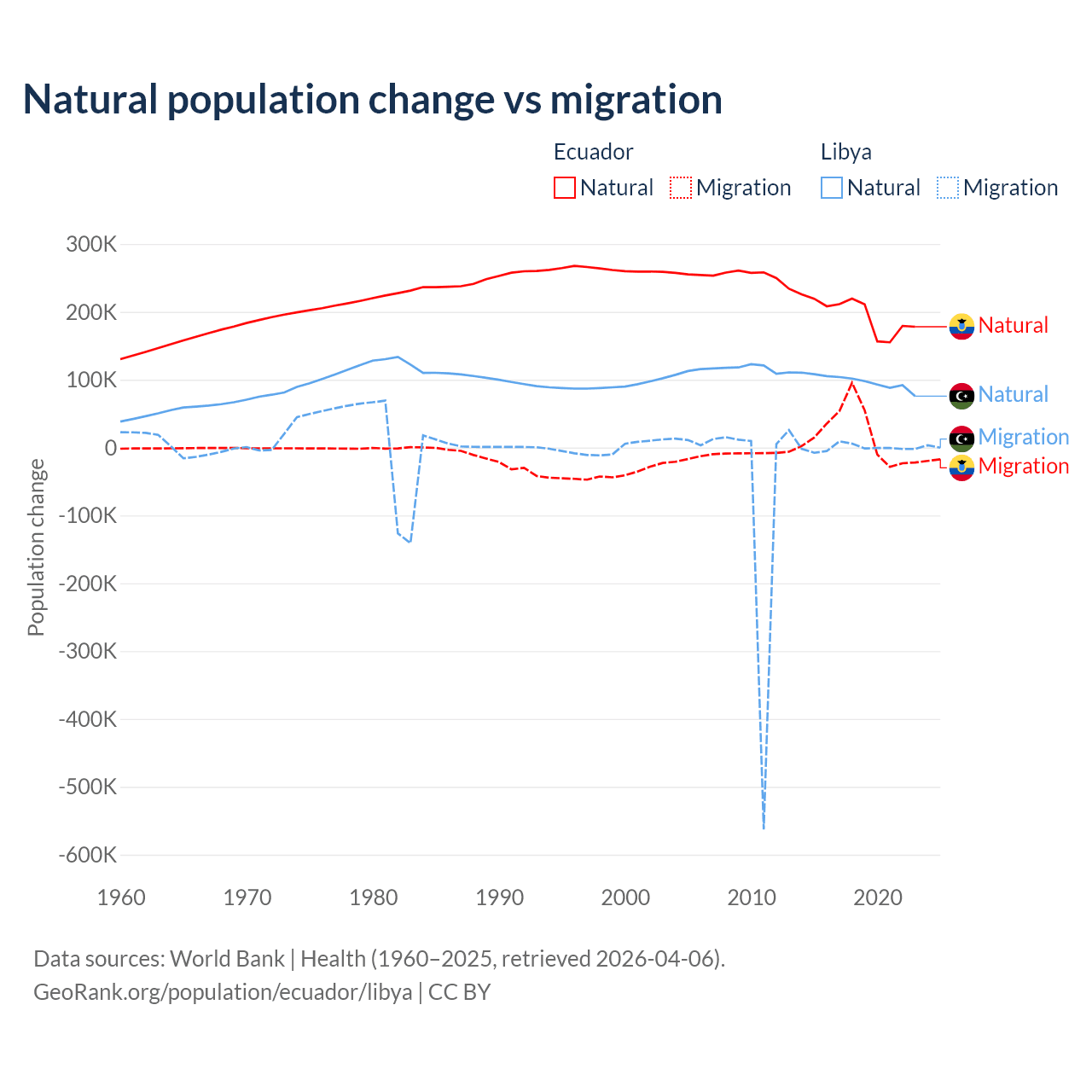 Over the last 10 years, 91.9% of the population change in Ecuador is from natural causes (a gain of 1,964,352 people) and 8.08% is from migration (a gain of 172,707 people). In Libya 99.4% is from natural causes (a gain of 975,799 people) and 0.63% is from migration (a loss of 6,150 people).