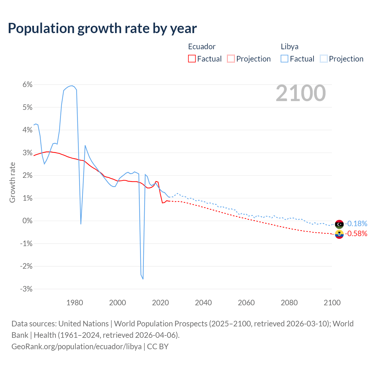 - For the last 10 years, Ecuador has had an average growth rate of +1.26% per year vs +1.44% in Libya.