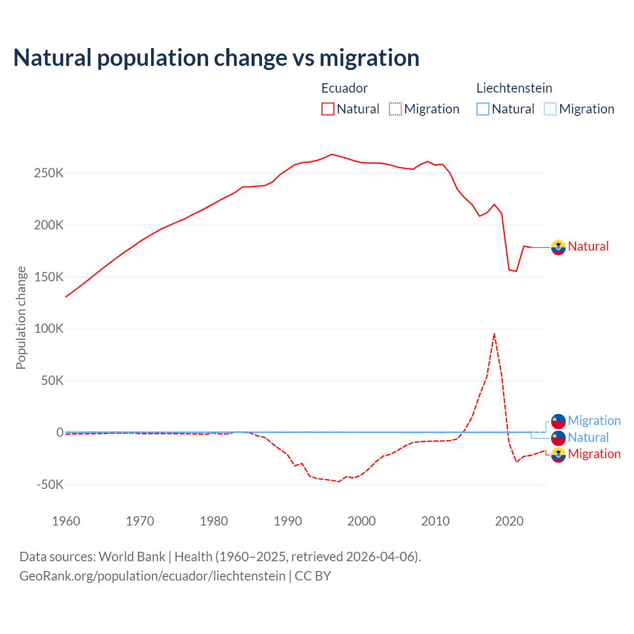Over the last 10 years, 91.9% of the population change in Ecuador is from natural causes (a gain of 1,964,352 people) and 8.08% is from migration (a gain of 172,707 people). In Liechtenstein 32.4% is from natural causes (a gain of 883 people) and 67.6% is from migration (a gain of 1,843 people).