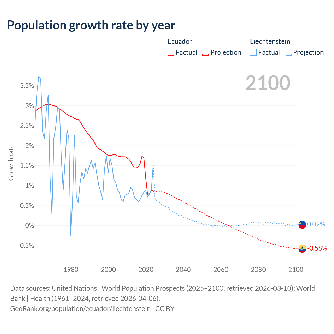 - For the last 10 years, Ecuador has had an average growth rate of +1.26% per year vs +0.82% in Liechtenstein.