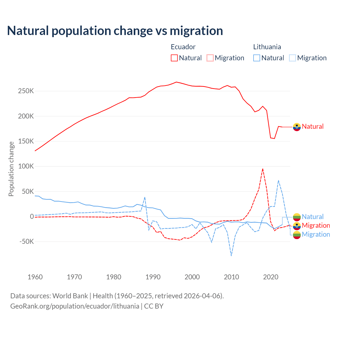 Over the last 10 years, 91.9% of the population change in Ecuador is from natural causes (a gain of 1,964,352 people) and 8.08% is from migration (a gain of 172,707 people). In Lithuania 68.7% is from natural causes (a loss of 153,859 people) and 31.3% is from migration (a gain of 70,196 people).