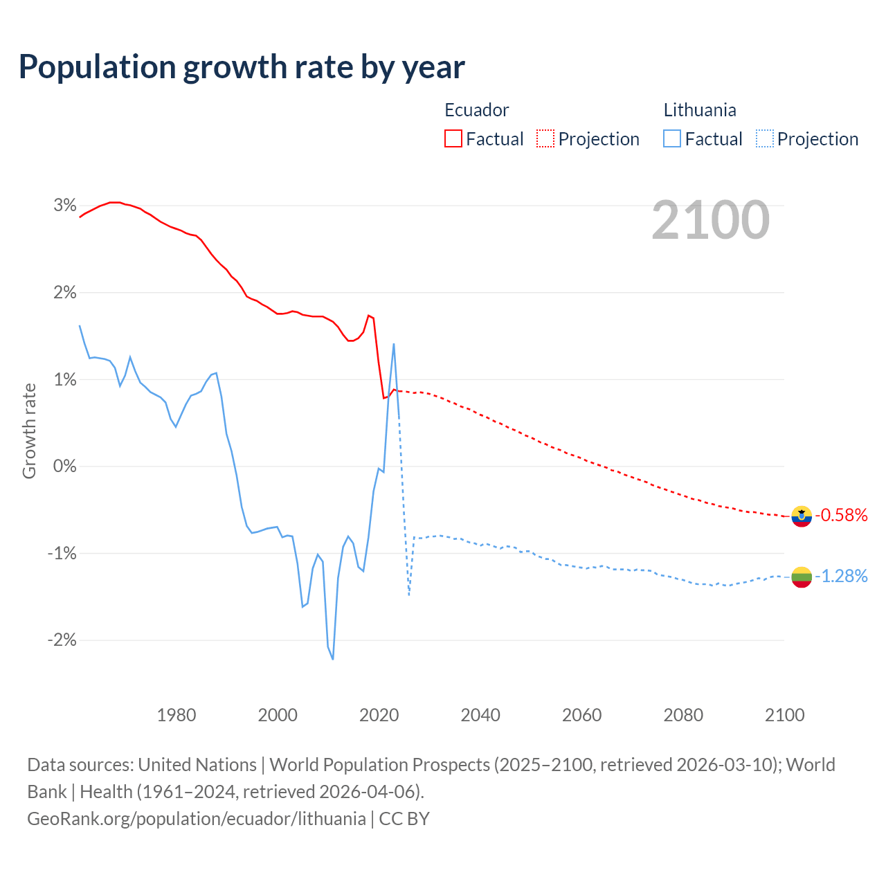 - For the last 10 years, Ecuador has had an average growth rate of +1.26% per year vs -0.22% in Lithuania.