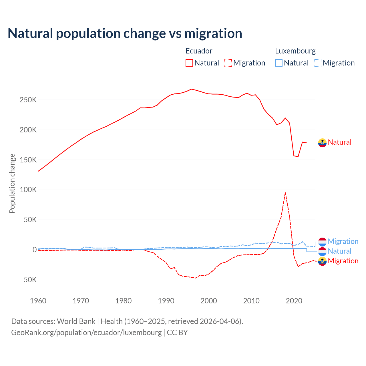 Over the last 10 years, 91.9% of the population change in Ecuador is from natural causes (a gain of 1,964,352 people) and 8.08% is from migration (a gain of 172,707 people). In Luxembourg 16.8% is from natural causes (a gain of 20,287 people) and 83.2% is from migration (a gain of 100,435 people).