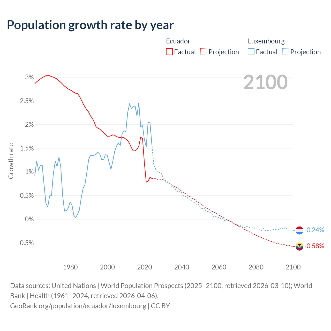 - For the last 10 years, Ecuador has had an average growth rate of +1.26% per year vs +2.02% in Luxembourg.