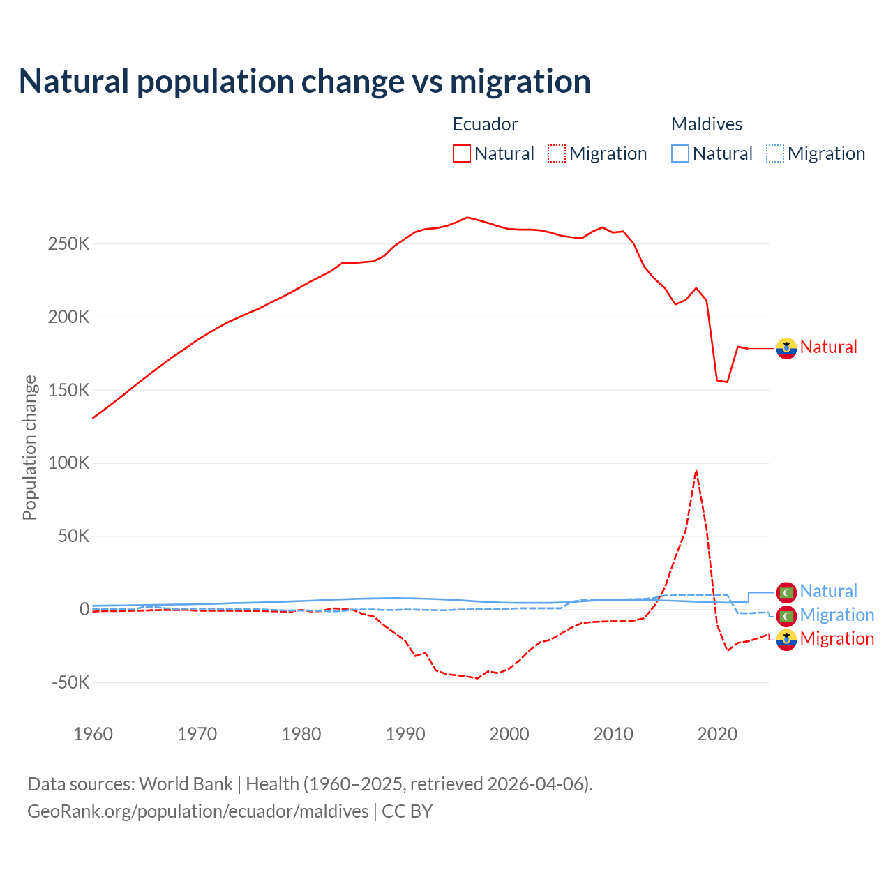 Over the last 10 years, 91.9% of the population change in Ecuador is from natural causes (a gain of 1,964,352 people) and 8.08% is from migration (a gain of 172,707 people). In Maldives 42.7% is from natural causes (a gain of 51,342 people) and 57.3% is from migration (a gain of 68,788 people).