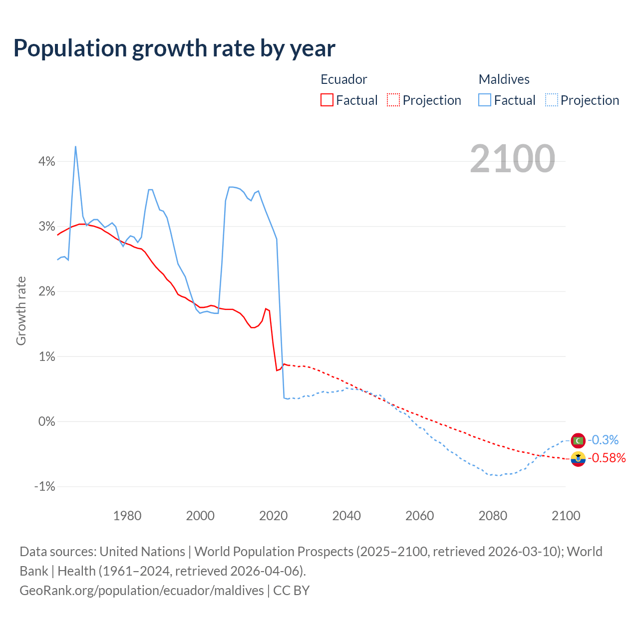 - For the last 10 years, Ecuador has had an average growth rate of +1.26% per year vs +2.56% in Maldives.