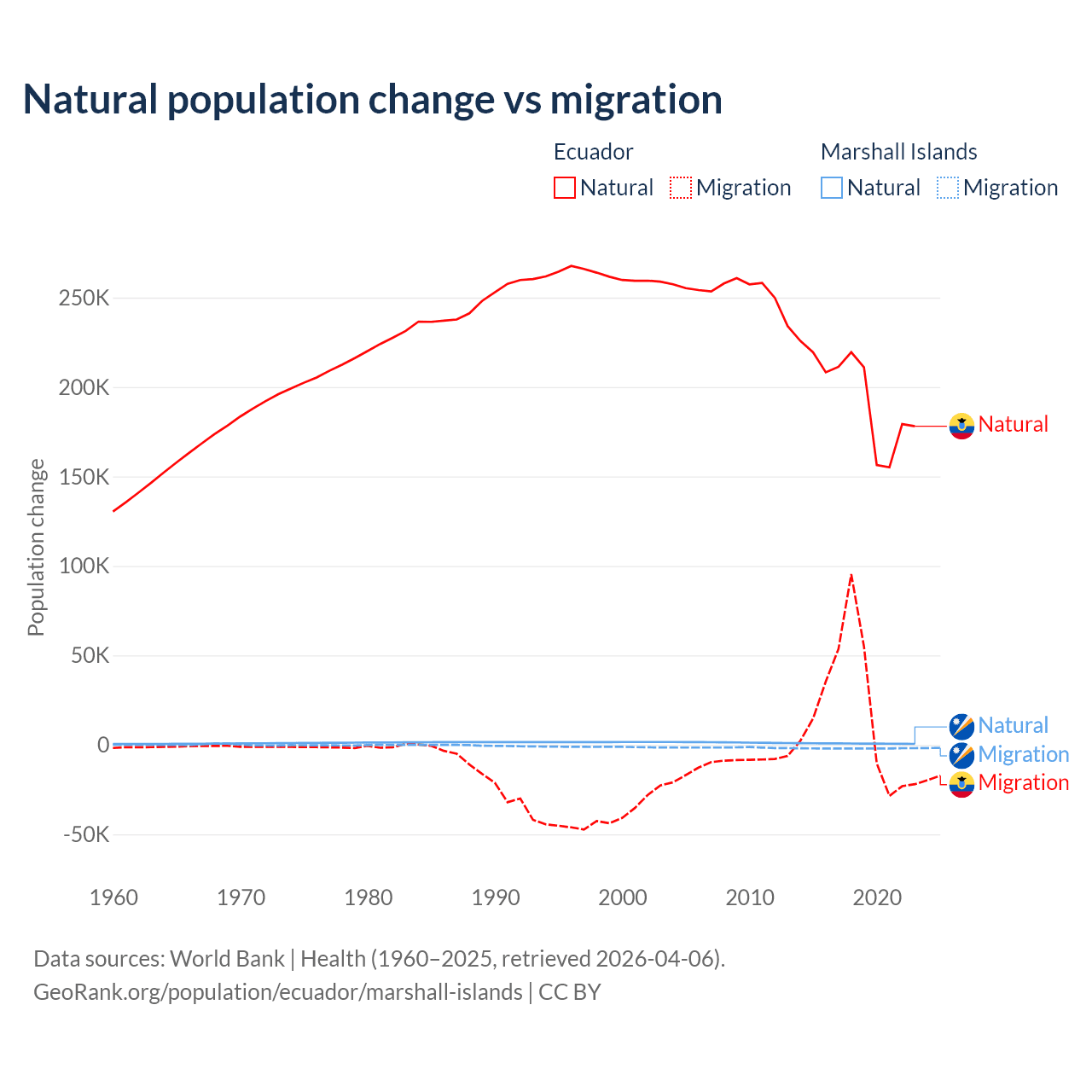 Over the last 10 years, 91.9% of the population change in Ecuador is from natural causes (a gain of 1,964,352 people) and 8.08% is from migration (a gain of 172,707 people). In the Marshall Islands 27.8% is from natural causes (a gain of 7,592 people) and 72.2% is from migration (a loss of 19,682 people).