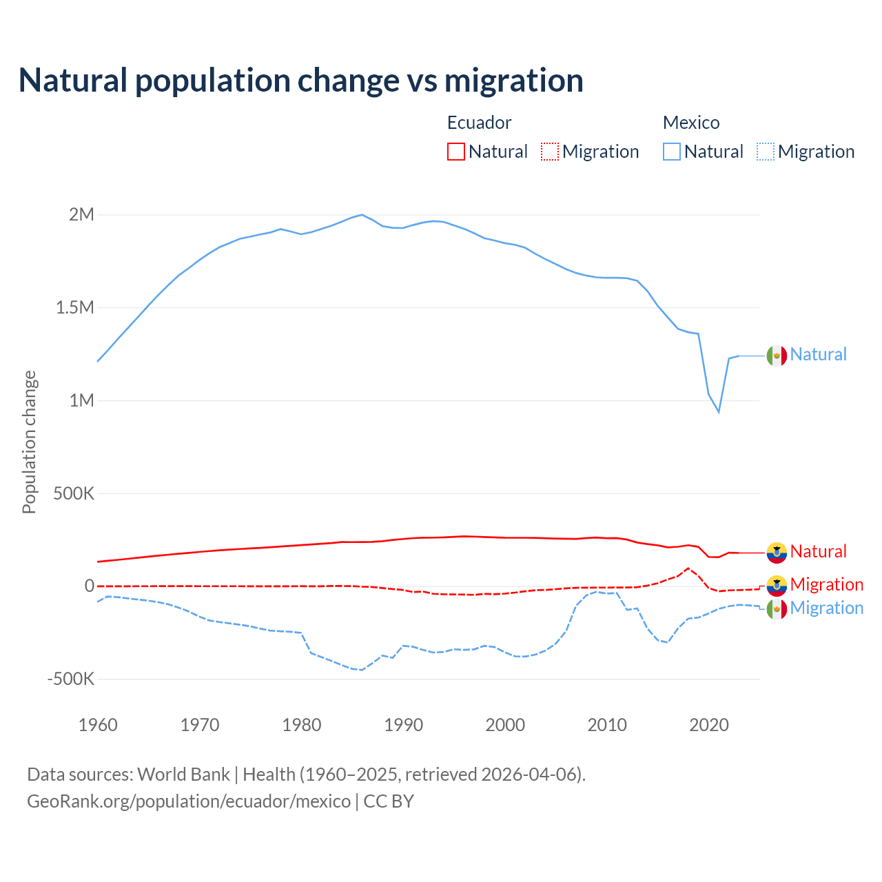 Over the last 10 years, 91.9% of the population change in Ecuador is from natural causes (a gain of 1,964,352 people) and 8.08% is from migration (a gain of 172,707 people). In Mexico 87.5% is from natural causes (a gain of 13,080,136 people) and 12.5% is from migration (a loss of 1,876,544 people).