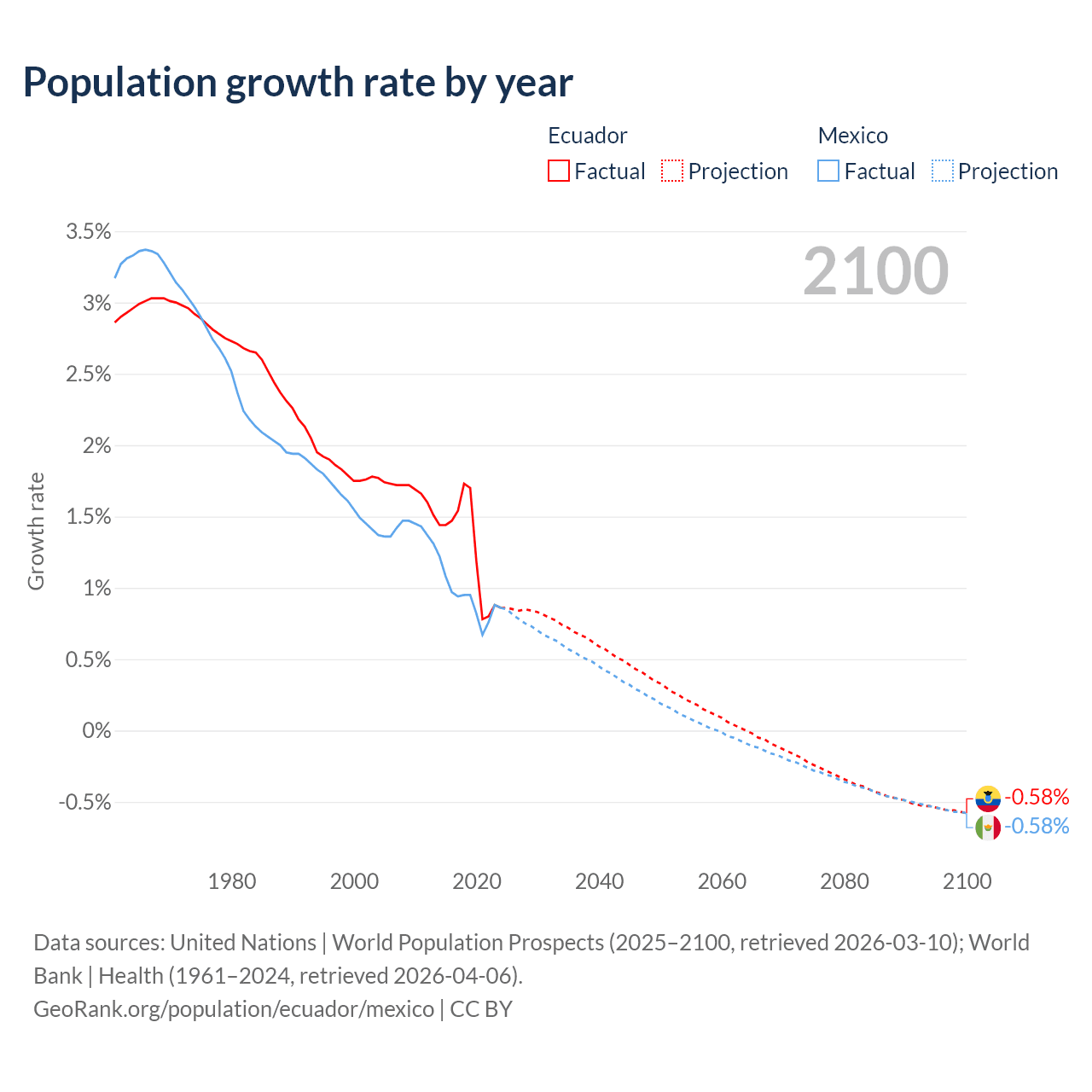 - For the last 10 years, Ecuador has had an average growth rate of +1.26% per year vs +0.92% in Mexico.
