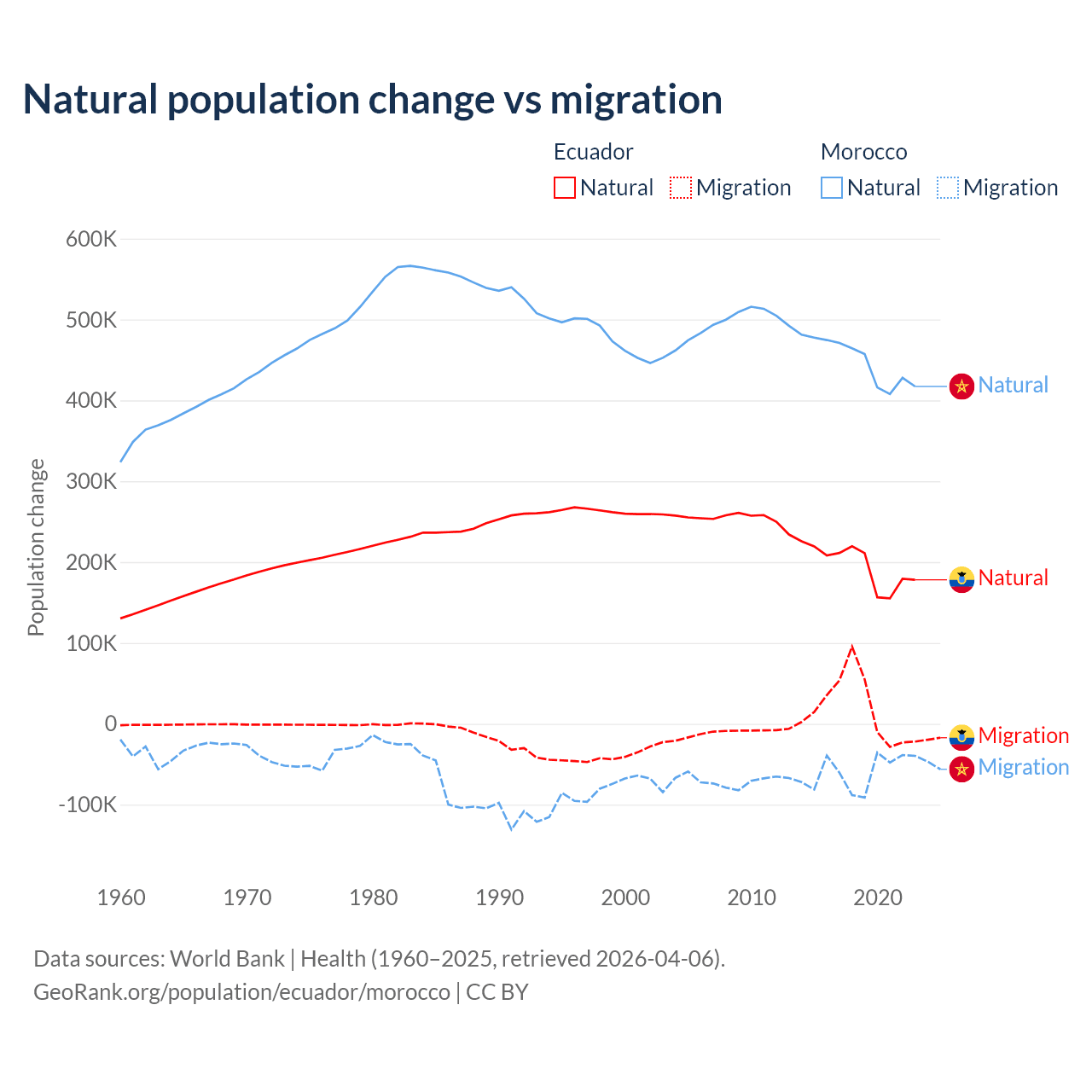 Over the last 10 years, 91.9% of the population change in Ecuador is from natural causes (a gain of 1,964,352 people) and 8.08% is from migration (a gain of 172,707 people). In Morocco 88.3% is from natural causes (a gain of 4,495,223 people) and 11.7% is from migration (a loss of 594,083 people).