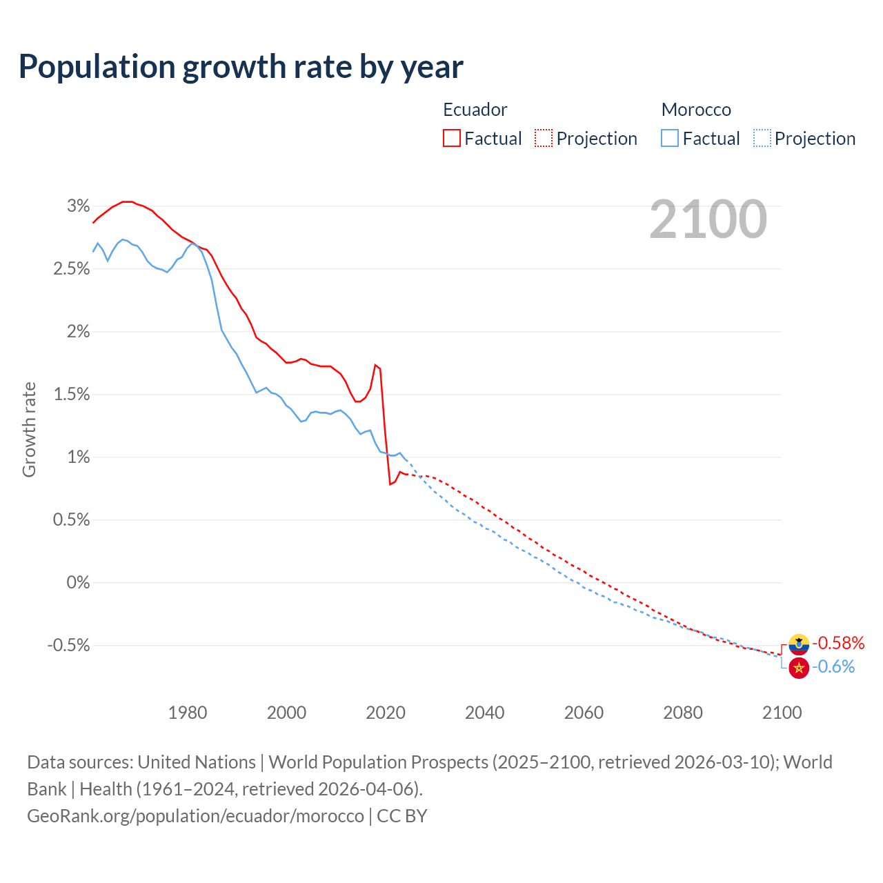 - For the last 10 years, Ecuador has had an average growth rate of +1.26% per year vs +1.09% in Morocco.