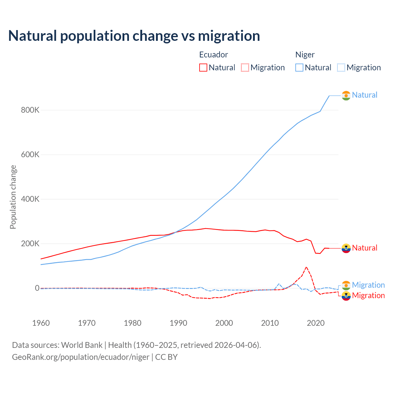 Over the last 10 years, 91.9% of the population change in Ecuador is from natural causes (a gain of 1,964,352 people) and 8.08% is from migration (a gain of 172,707 people). In Niger 100% is from natural causes (a gain of 7,728,287 people) and 0.03% is from migration (a gain of 2,520 people).