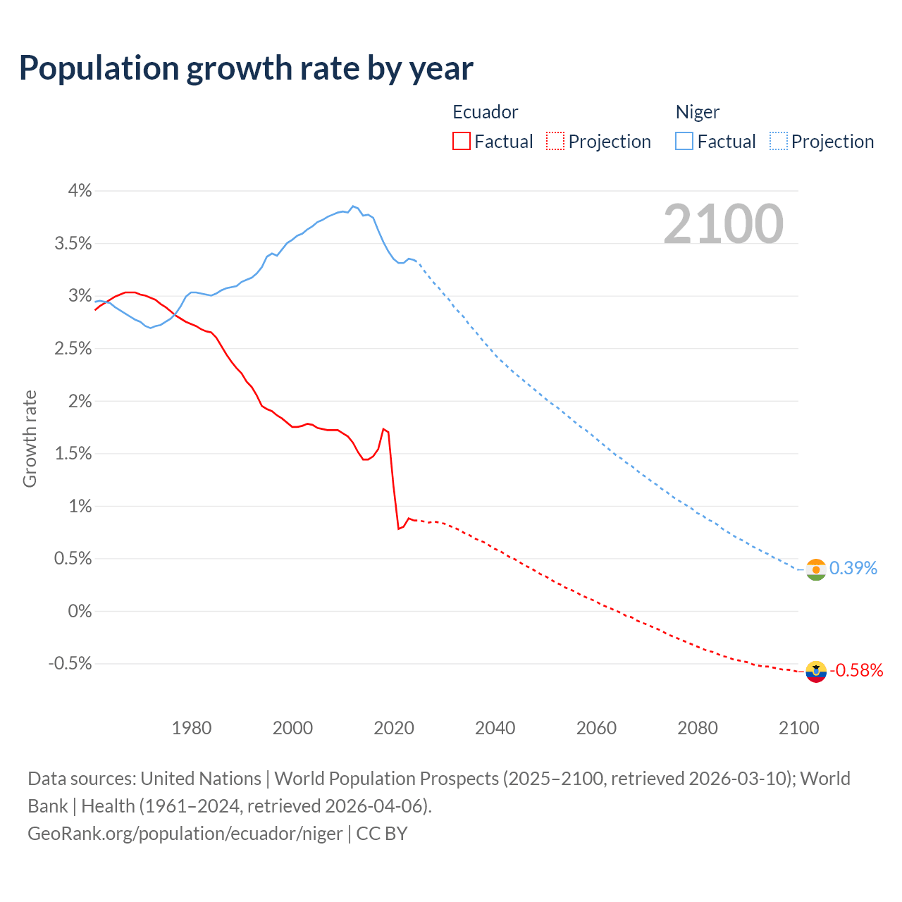 - For the last 10 years, Ecuador has had an average growth rate of +1.26% per year vs +3.5% in Niger.