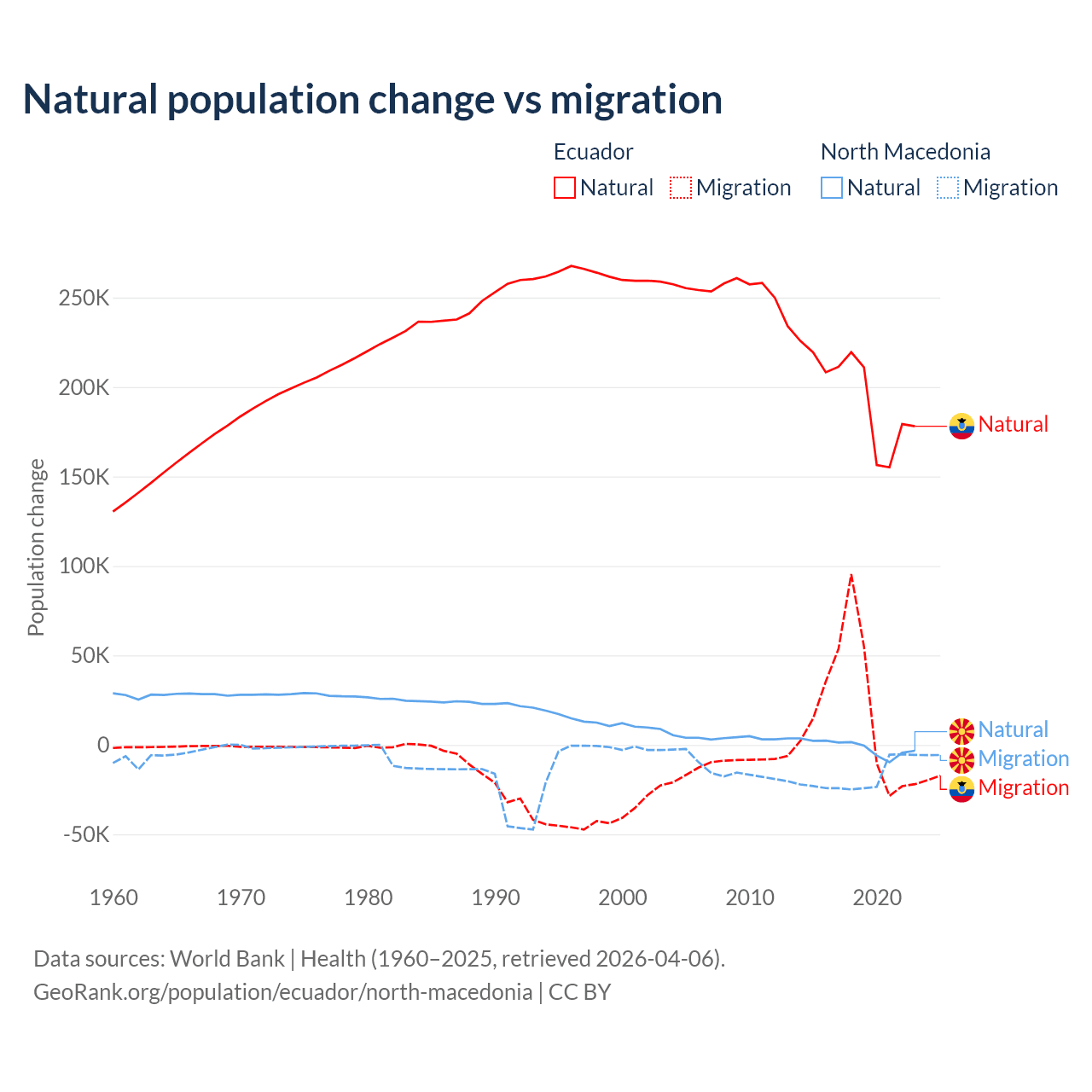 Over the last 10 years, 91.9% of the population change in Ecuador is from natural causes (a gain of 1,964,352 people) and 8.08% is from migration (a gain of 172,707 people). In North Macedonia 6.45% is from natural causes (a loss of 12,585 people) and 93.5% is from migration (a loss of 182,429 people).