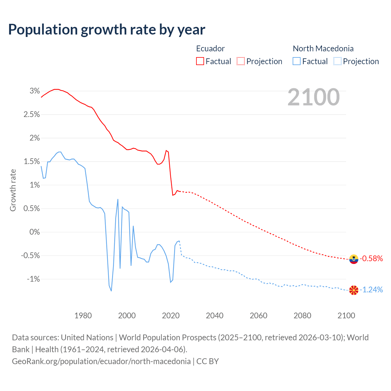 - For the last 10 years, Ecuador has had an average growth rate of +1.26% per year vs -0.48% in North Macedonia.