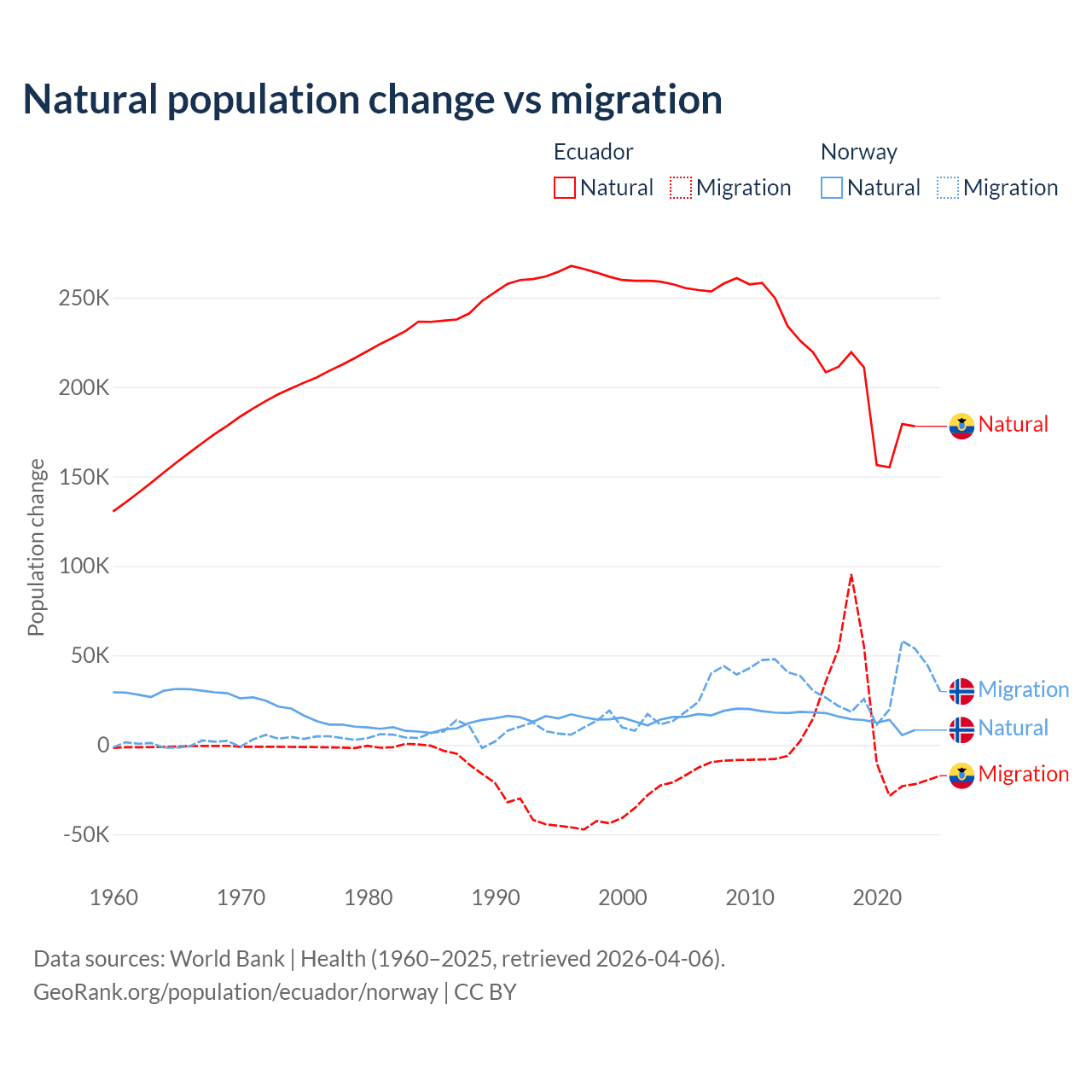 Over the last 10 years, 91.9% of the population change in Ecuador is from natural causes (a gain of 1,964,352 people) and 8.08% is from migration (a gain of 172,707 people). In Norway 31.3% is from natural causes (a gain of 138,699 people) and 68.7% is from migration (a gain of 303,945 people).
