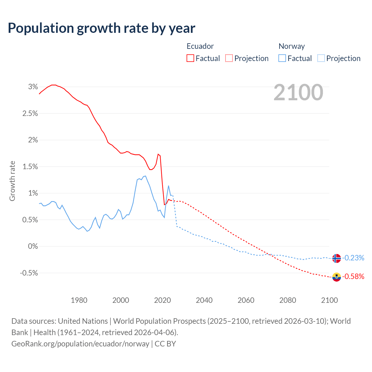 - For the last 10 years, Ecuador has had an average growth rate of +1.26% per year vs +0.85% in Norway.