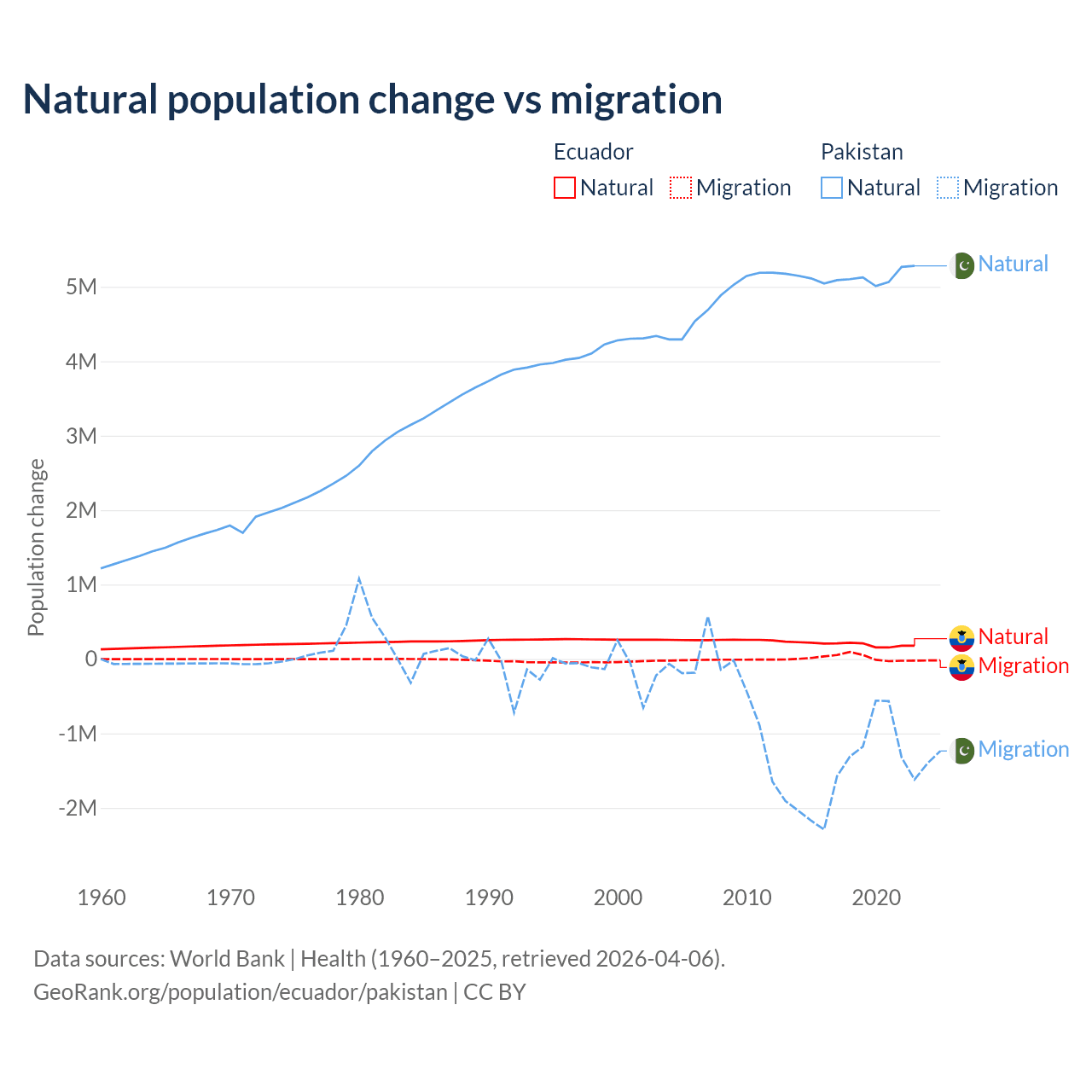 Over the last 10 years, 91.9% of the population change in Ecuador is from natural causes (a gain of 1,964,352 people) and 8.08% is from migration (a gain of 172,707 people). In Pakistan 77.8% is from natural causes (a gain of 51,255,404 people) and 22.2% is from migration (a loss of 14,629,055 people).