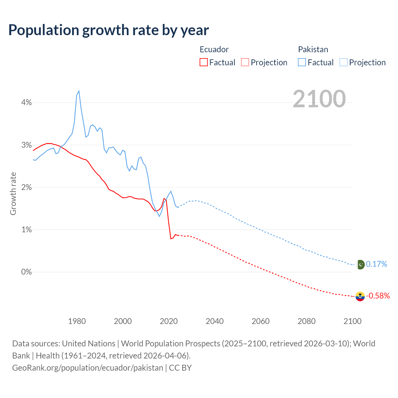 - For the last 10 years, Ecuador has had an average growth rate of +1.26% per year vs +1.6% in Pakistan.