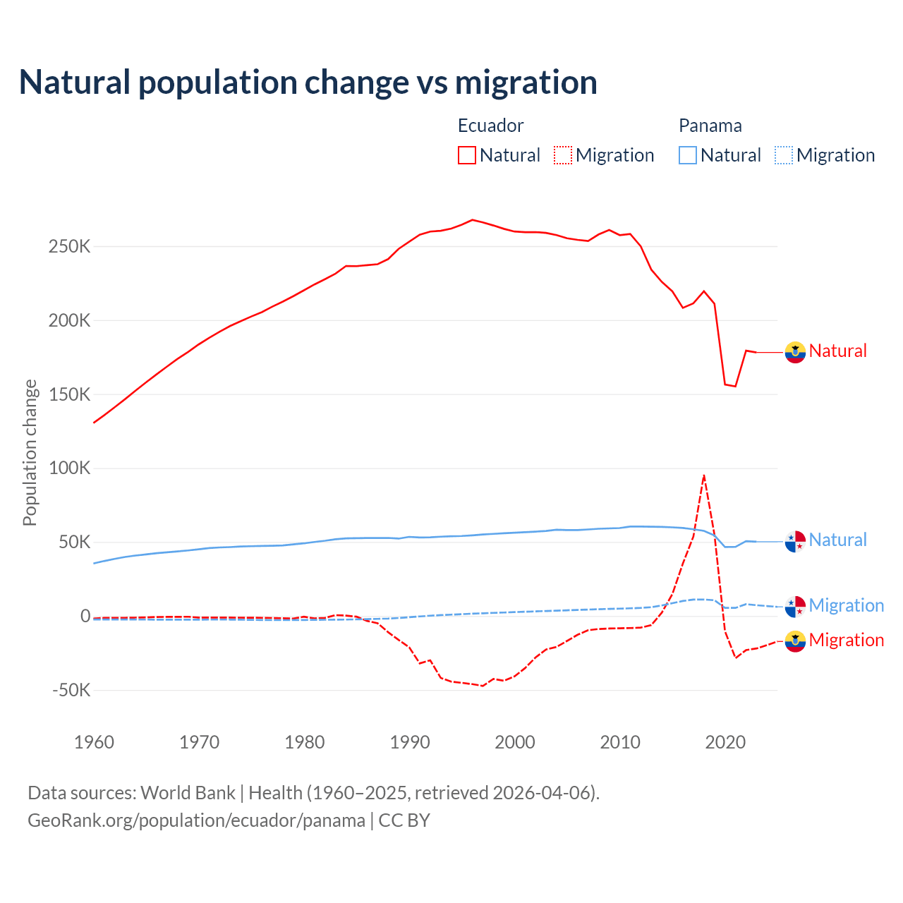 Over the last 10 years, 91.9% of the population change in Ecuador is from natural causes (a gain of 1,964,352 people) and 8.08% is from migration (a gain of 172,707 people). In Panama 86.5% is from natural causes (a gain of 544,211 people) and 13.5% is from migration (a gain of 84,849 people).