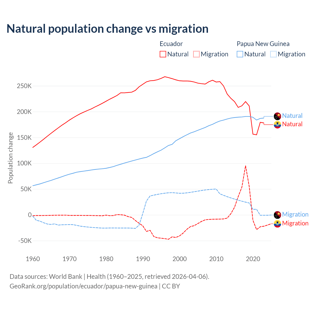 Over the last 10 years, 91.9% of the population change in Ecuador is from natural causes (a gain of 1,964,352 people) and 8.08% is from migration (a gain of 172,707 people). In Papua New Guinea 91% is from natural causes (a gain of 1,883,906 people) and 8.98% is from migration (a gain of 185,900 people).
