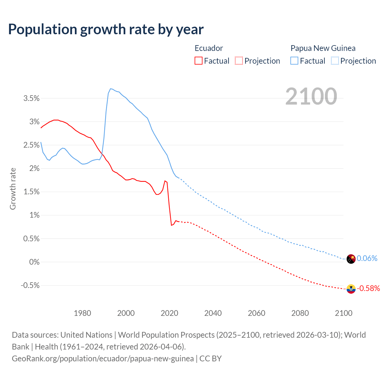 - For the last 10 years, Ecuador has had an average growth rate of +1.26% per year vs +2.23% in Papua New Guinea.