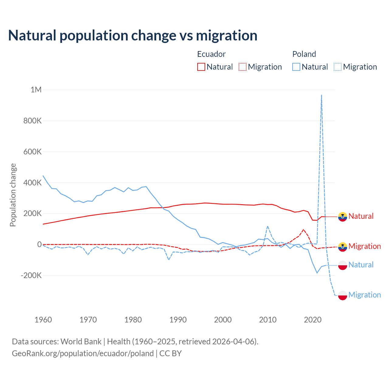 Over the last 10 years, 91.9% of the population change in Ecuador is from natural causes (a gain of 1,964,352 people) and 8.08% is from migration (a gain of 172,707 people). In Poland 41.4% is from natural causes (a loss of 675,443 people) and 58.6% is from migration (a gain of 955,766 people).