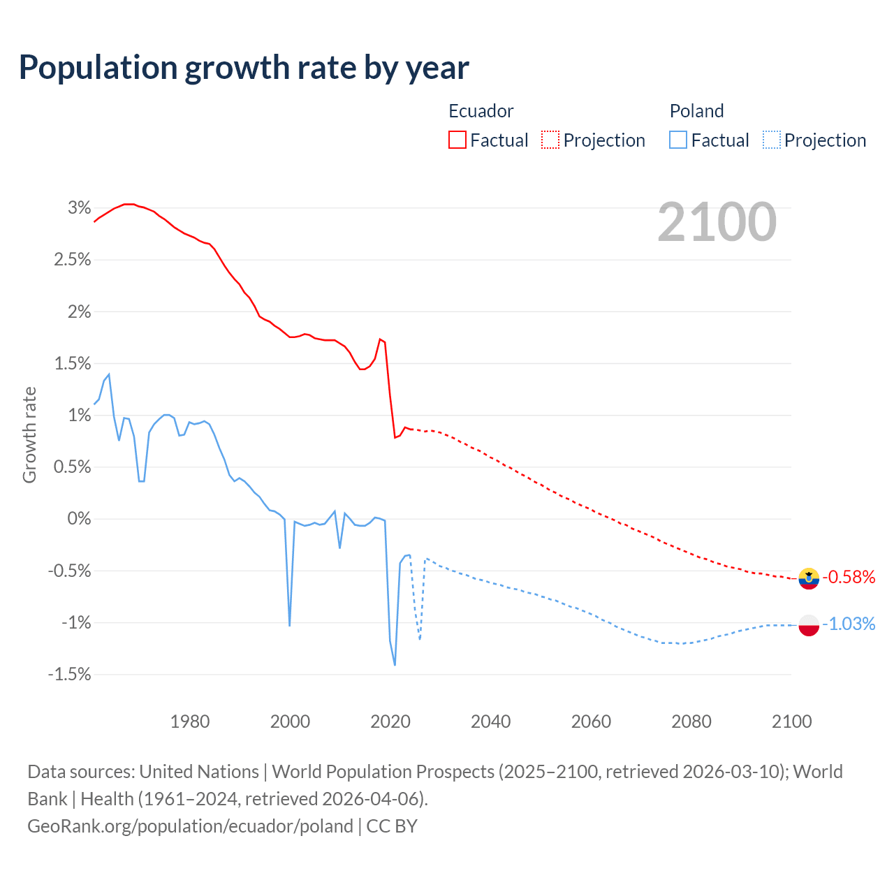 - For the last 10 years, Ecuador has had an average growth rate of +1.26% per year vs -0.36% in Poland.