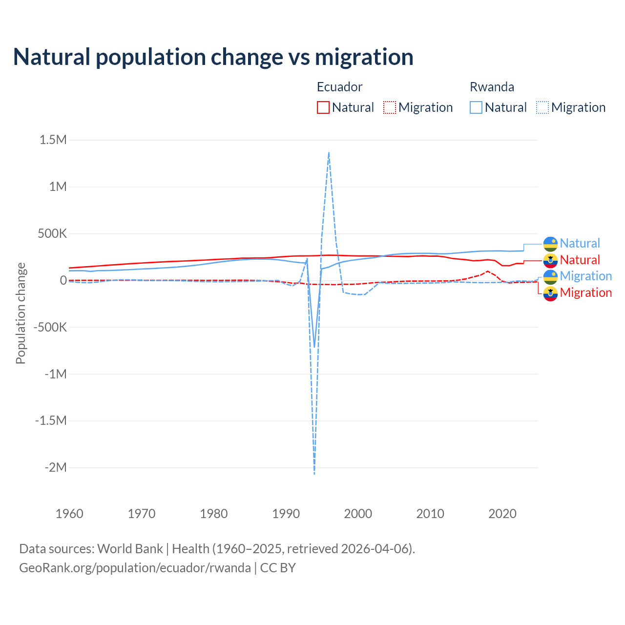 Over the last 10 years, 91.9% of the population change in Ecuador is from natural causes (a gain of 1,964,352 people) and 8.08% is from migration (a gain of 172,707 people). In Rwanda 93.8% is from natural causes (a gain of 3,081,296 people) and 6.18% is from migration (a loss of 203,035 people).