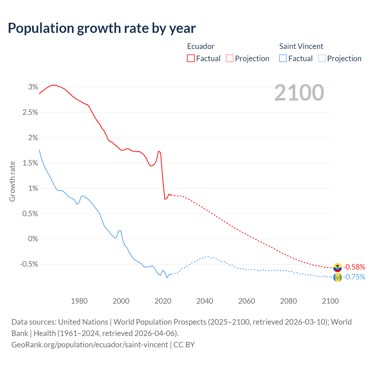 - For the last 10 years, Ecuador has had an average growth rate of +1.26% per year vs -0.65% in Saint Vincent.