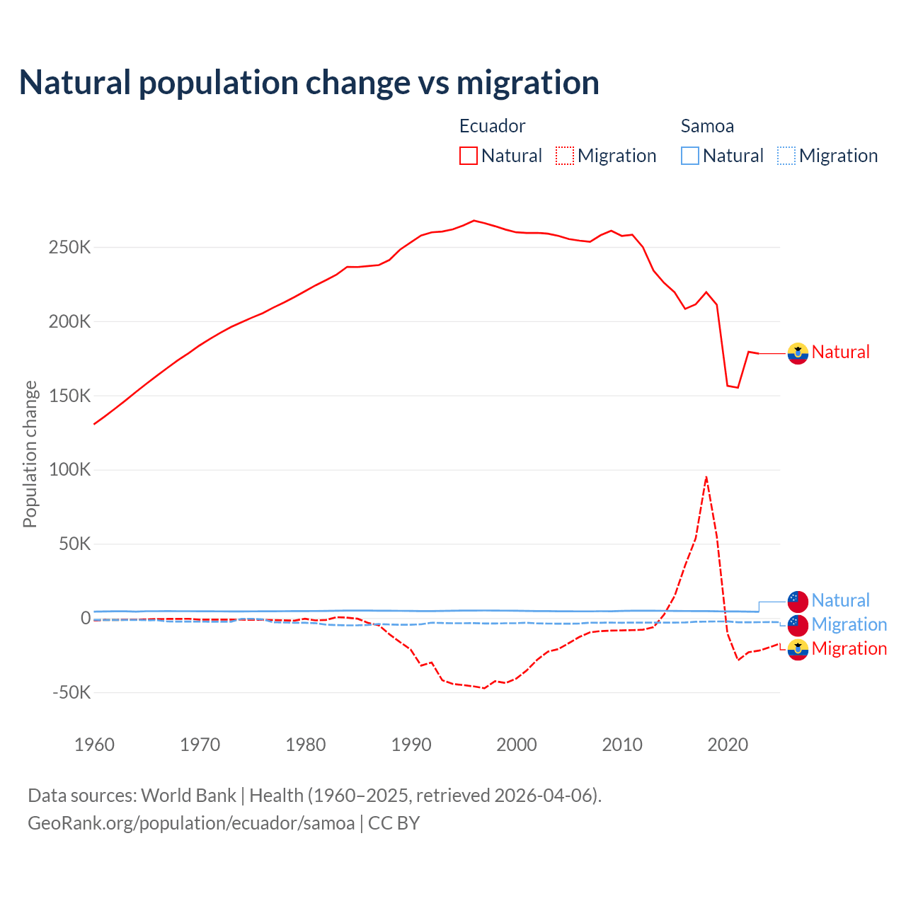 Over the last 10 years, 91.9% of the population change in Ecuador is from natural causes (a gain of 1,964,352 people) and 8.08% is from migration (a gain of 172,707 people). In Samoa 62.5% is from natural causes (a gain of 45,436 people) and 37.5% is from migration (a loss of 27,246 people).