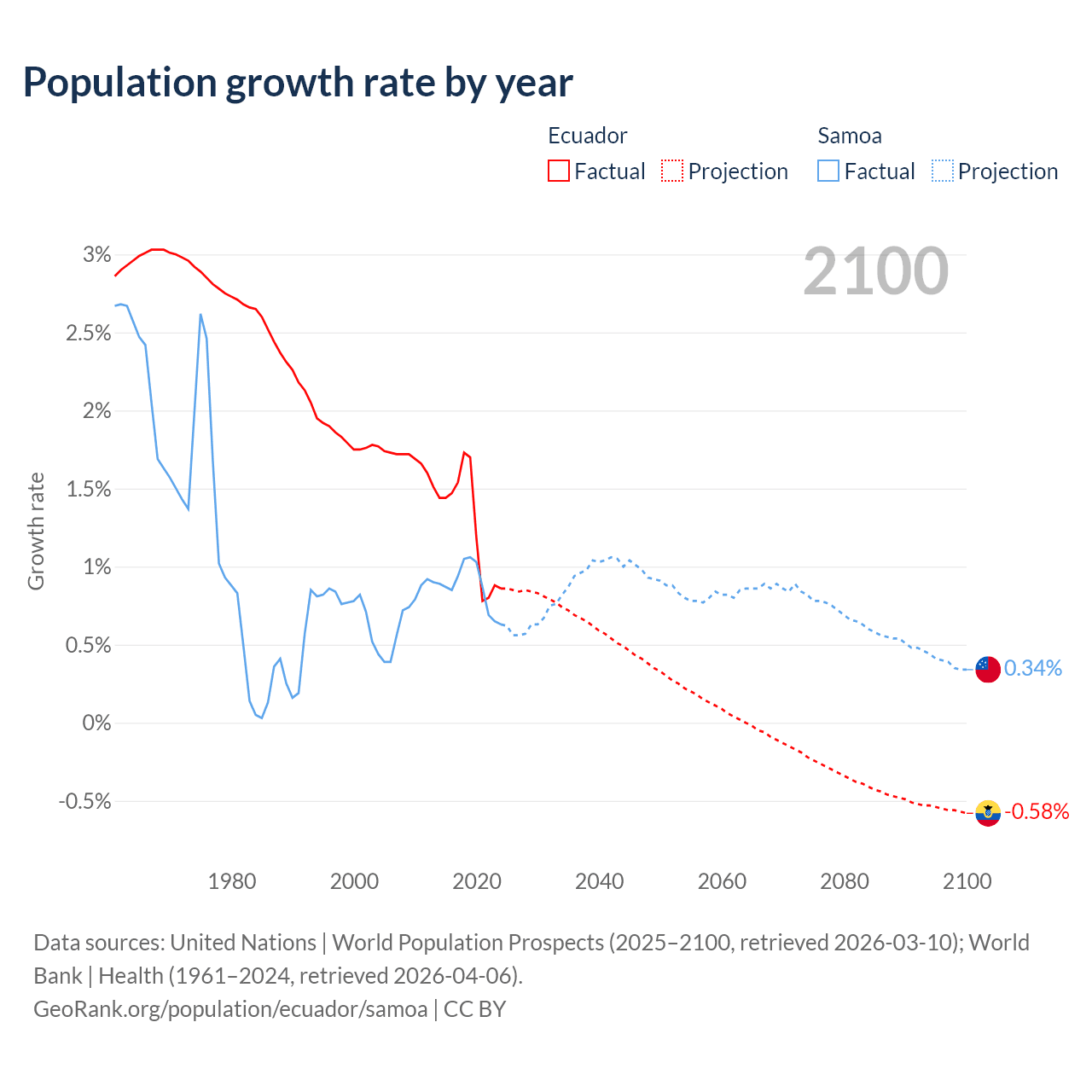 - For the last 10 years, Ecuador has had an average growth rate of +1.26% per year vs +0.87% in Samoa.