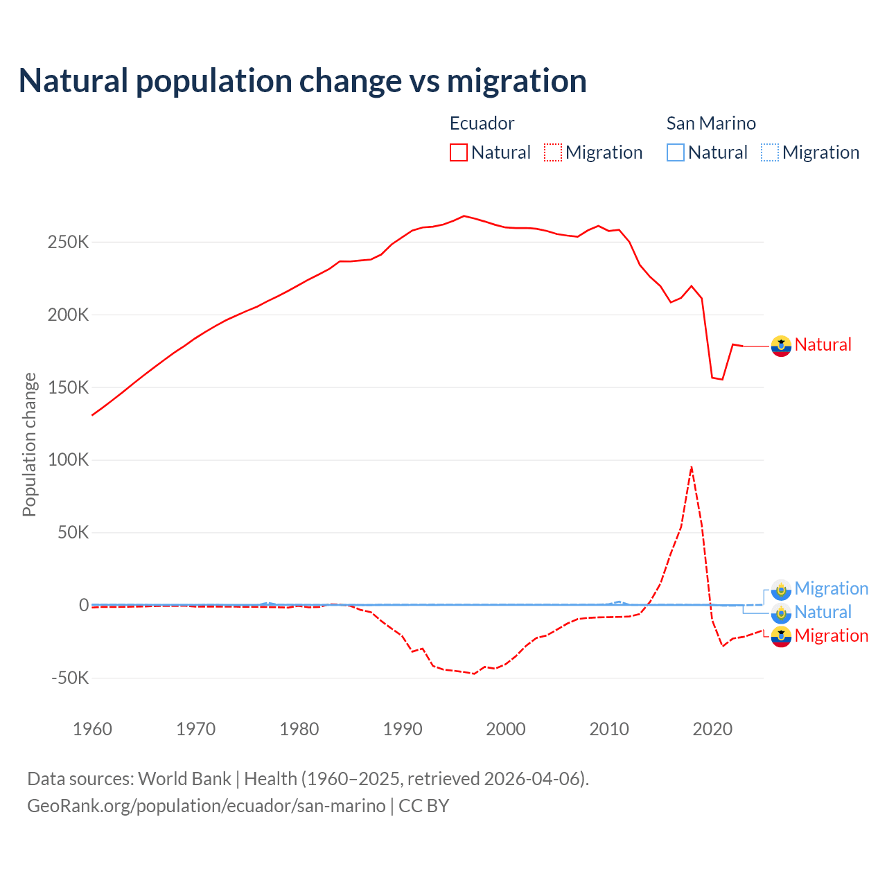 Over the last 10 years, 91.9% of the population change in Ecuador is from natural causes (a gain of 1,964,352 people) and 8.08% is from migration (a gain of 172,707 people). In San Marino 40.9% is from natural causes (a loss of 358 people) and 59.1% is from migration (a gain of 517 people).