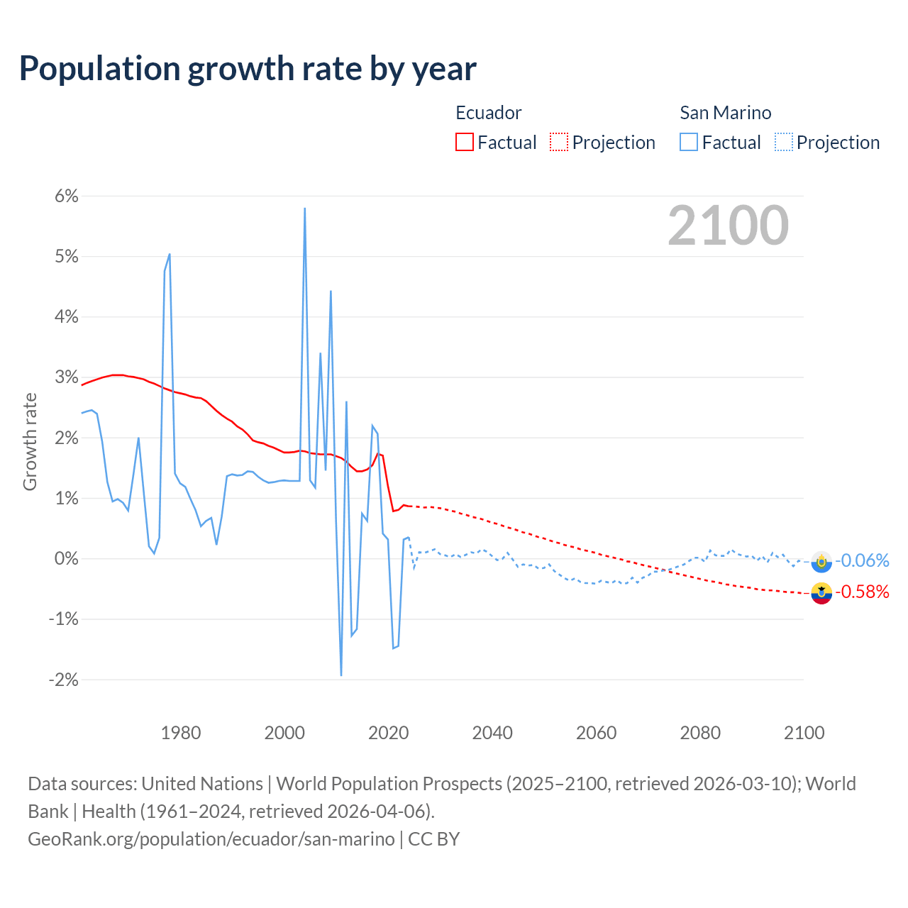 - For the last 10 years, Ecuador has had an average growth rate of +1.26% per year vs +0.26% in San Marino.
