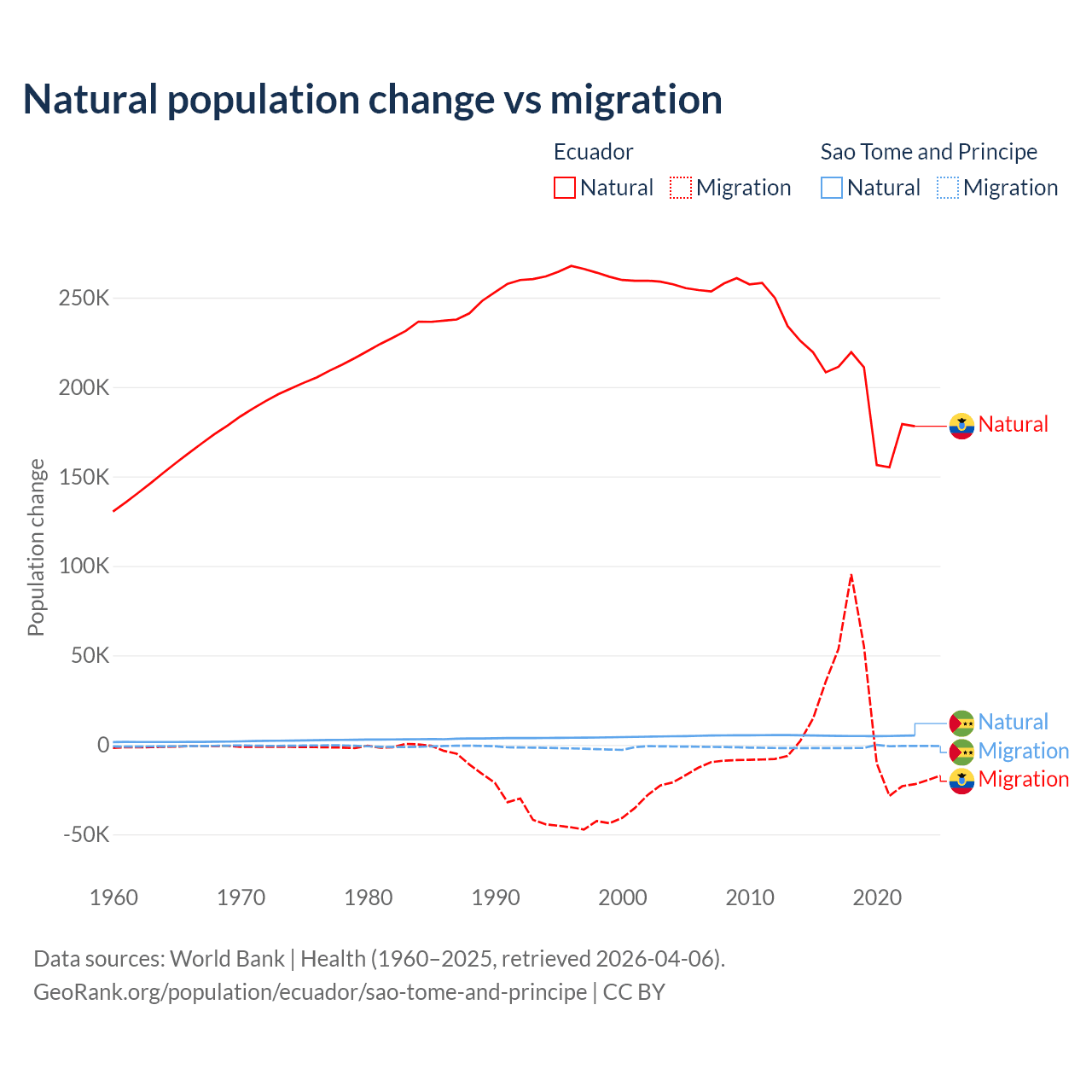 Over the last 10 years, 91.9% of the population change in Ecuador is from natural causes (a gain of 1,964,352 people) and 8.08% is from migration (a gain of 172,707 people). In Sao Tome and Principe 80.1% is from natural causes (a gain of 50,822 people) and 19.9% is from migration (a loss of 12,621 people).