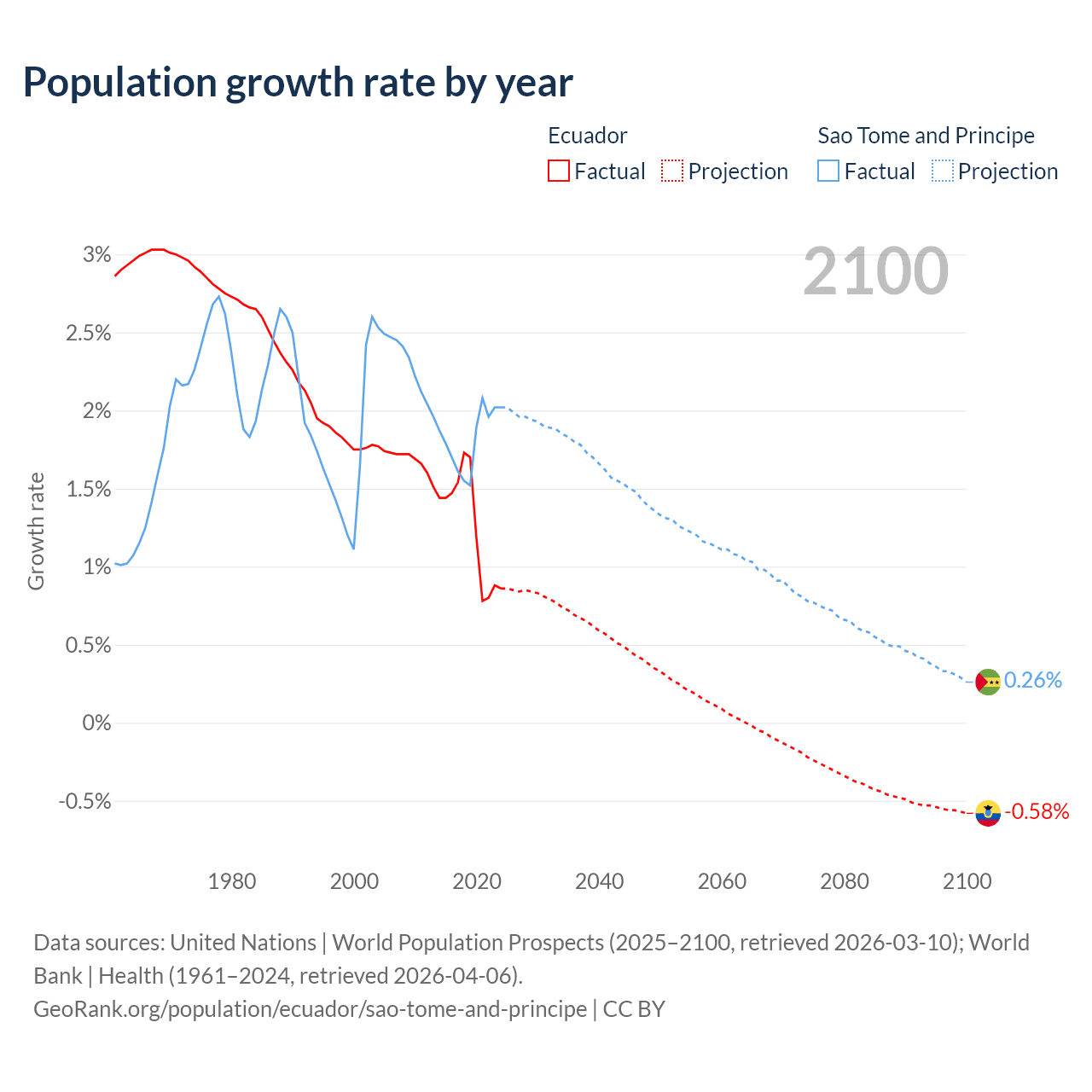 - For the last 10 years, Ecuador has had an average growth rate of +1.26% per year vs +1.82% in Sao Tome and Principe.