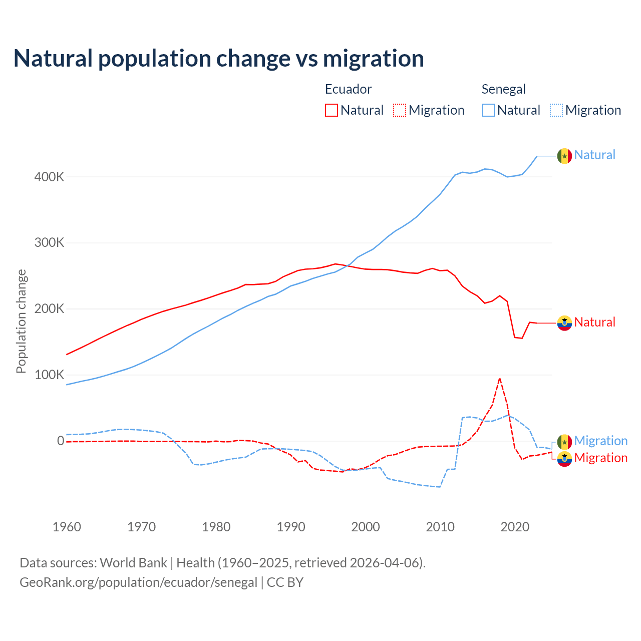 Over the last 10 years, 91.9% of the population change in Ecuador is from natural causes (a gain of 1,964,352 people) and 8.08% is from migration (a gain of 172,707 people). In Senegal 93.9% is from natural causes (a gain of 4,089,205 people) and 6.13% is from migration (a gain of 267,266 people).