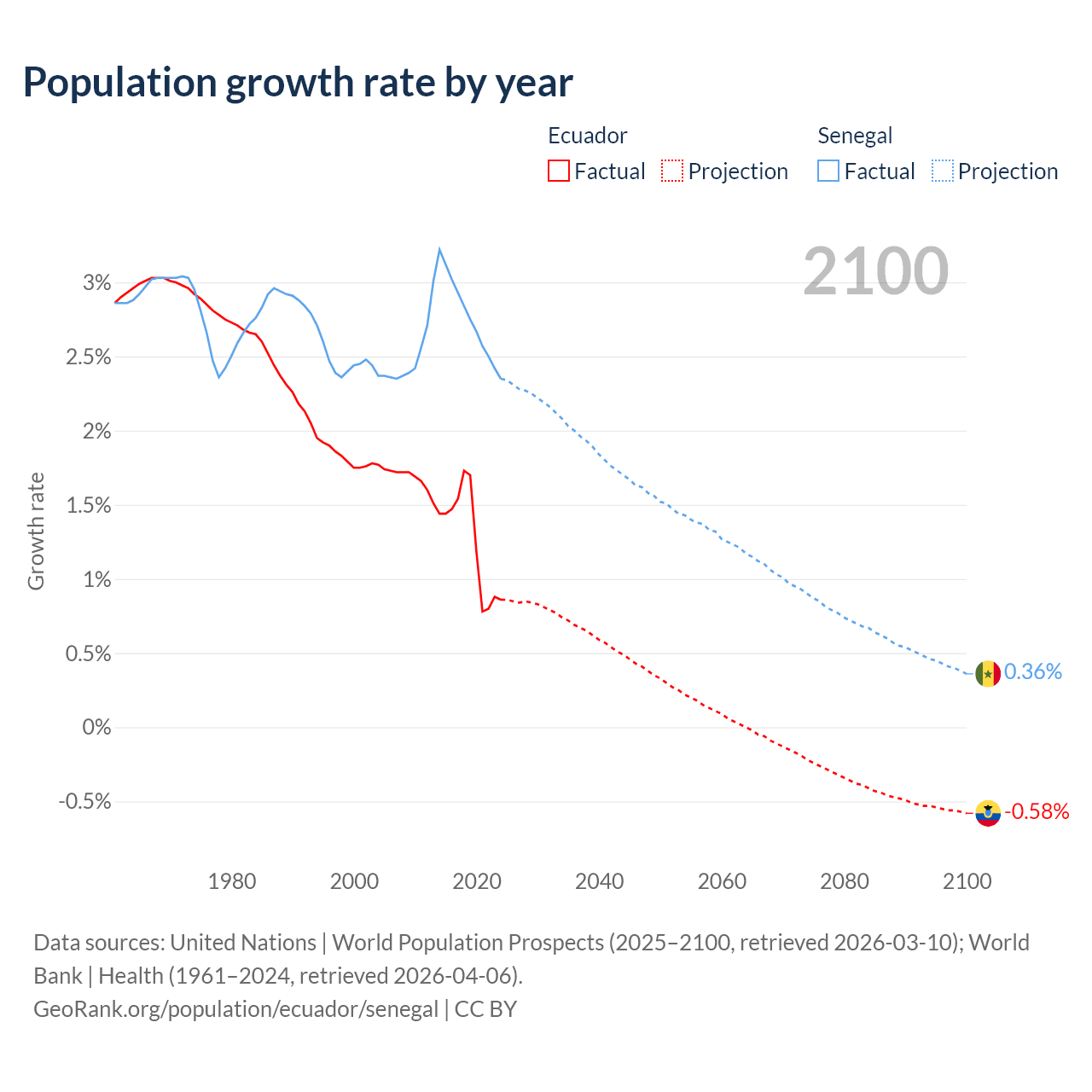 - For the last 10 years, Ecuador has had an average growth rate of +1.26% per year vs +2.76% in Senegal.