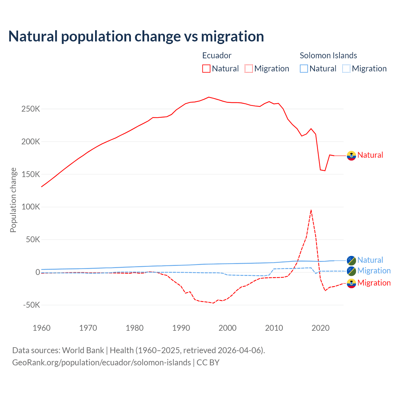 Over the last 10 years, 91.9% of the population change in Ecuador is from natural causes (a gain of 1,964,352 people) and 8.08% is from migration (a gain of 172,707 people). In the Solomon Islands 82.8% is from natural causes (a gain of 168,727 people) and 17.2% is from migration (a gain of 35,031 people).
