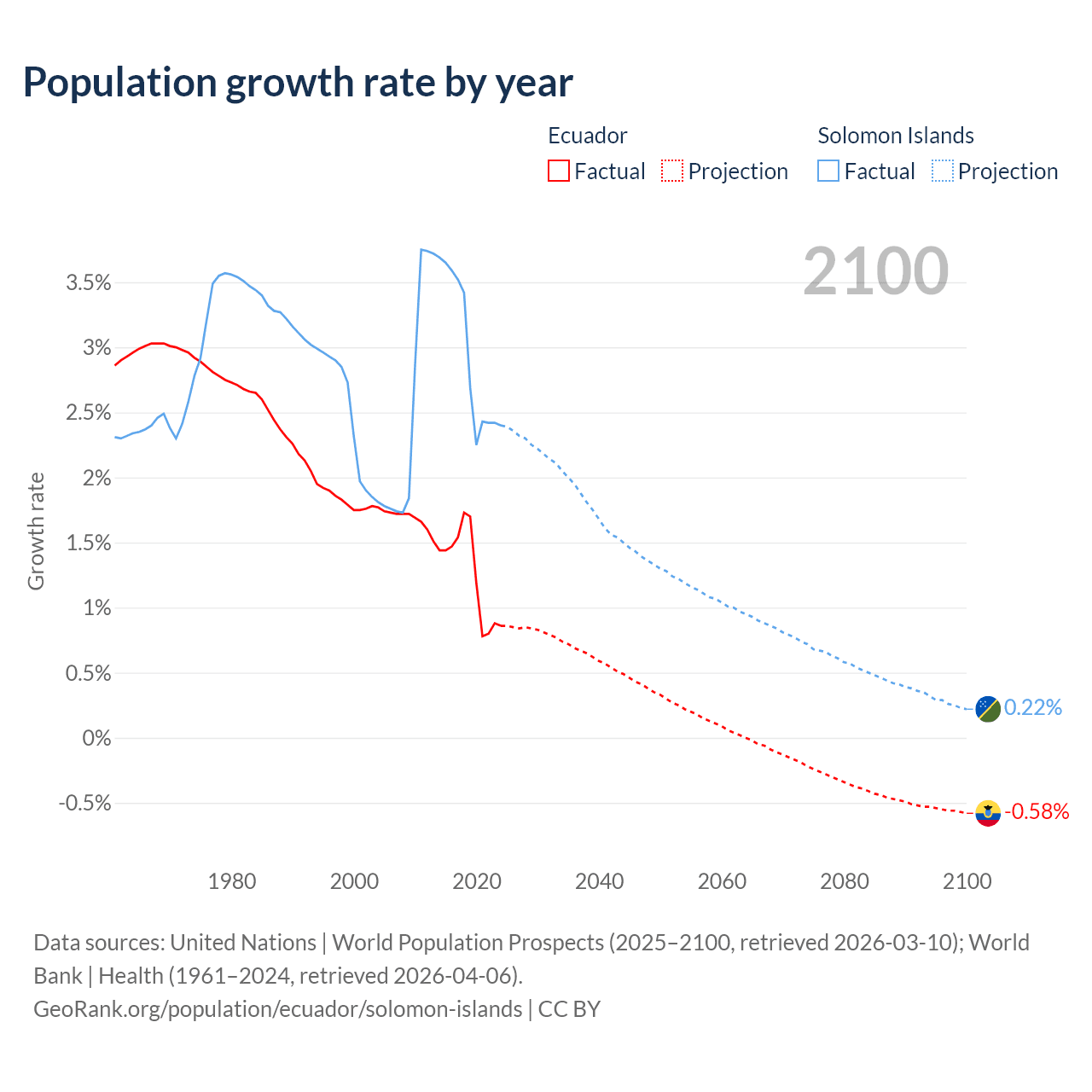 - For the last 10 years, Ecuador has had an average growth rate of +1.26% per year vs +2.95% in the Solomon Islands.