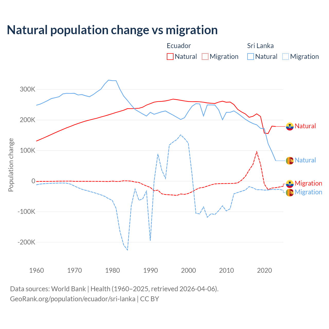 Over the last 10 years, 91.9% of the population change in Ecuador is from natural causes (a gain of 1,964,352 people) and 8.08% is from migration (a gain of 172,707 people). In Sri Lanka 85.3% is from natural causes (a gain of 1,605,749 people) and 14.7% is from migration (a loss of 276,121 people).