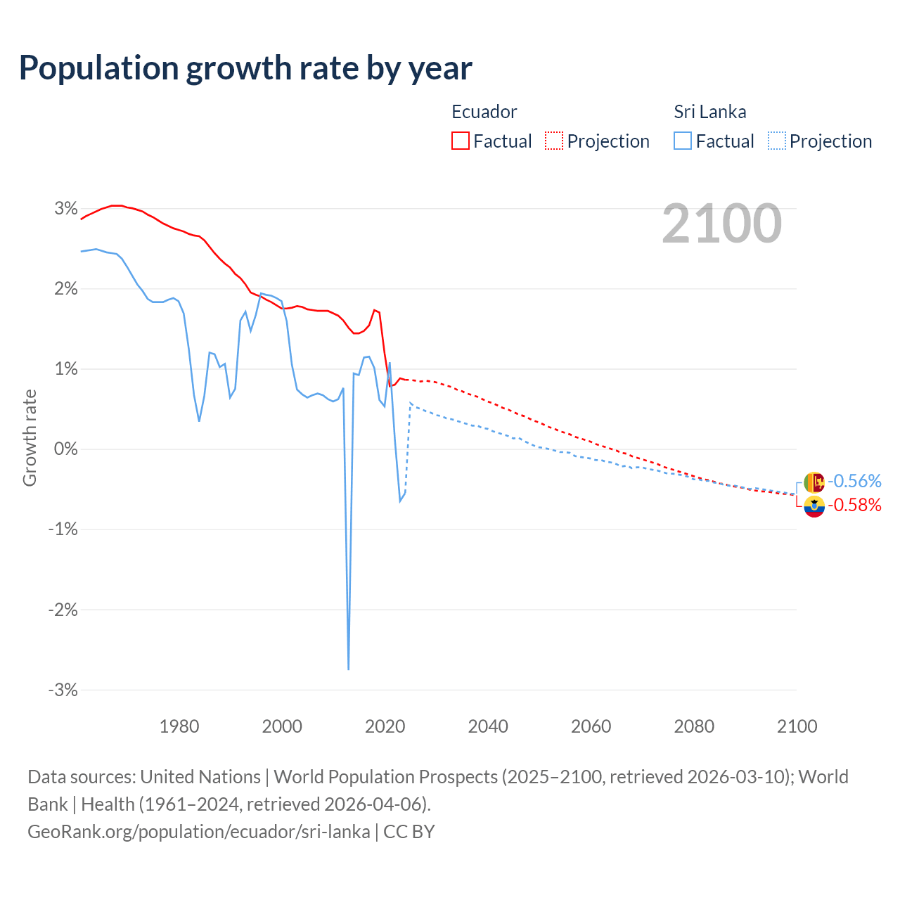 - For the last 10 years, Ecuador has had an average growth rate of +1.26% per year vs +0.57% in Sri Lanka.