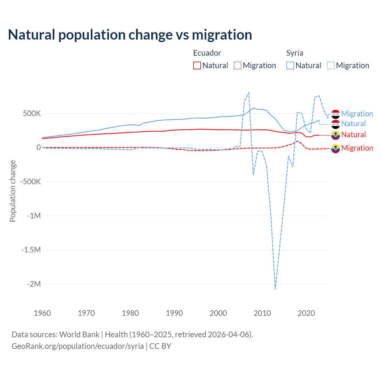 Over the last 10 years, 91.9% of the population change in Ecuador is from natural causes (a gain of 1,964,352 people) and 8.08% is from migration (a gain of 172,707 people). In Syria 91.3% is from natural causes (a gain of 3,047,621 people) and 8.72% is from migration (a gain of 291,069 people).