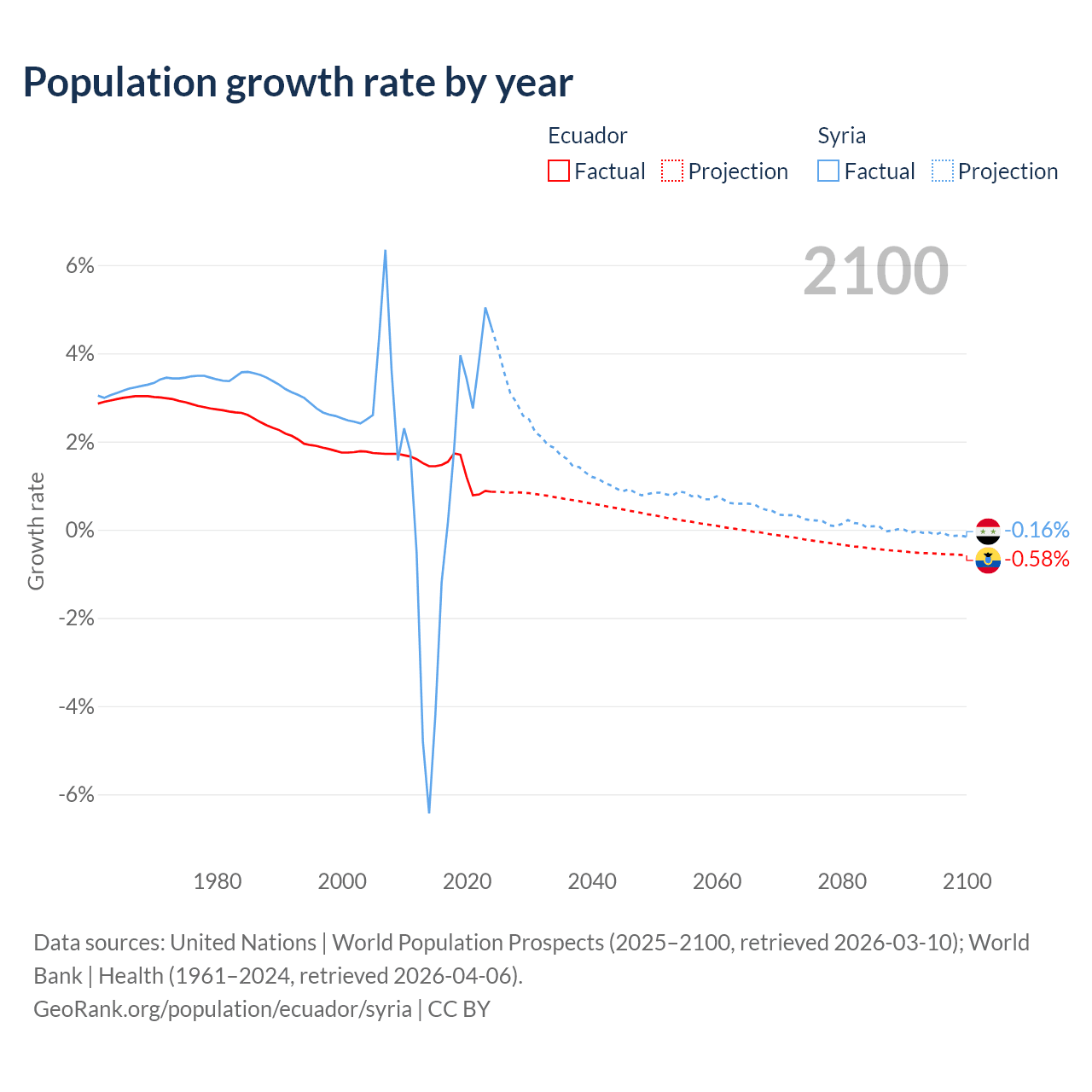 - For the last 10 years, Ecuador has had an average growth rate of +1.26% per year vs +1.25% in Syria.