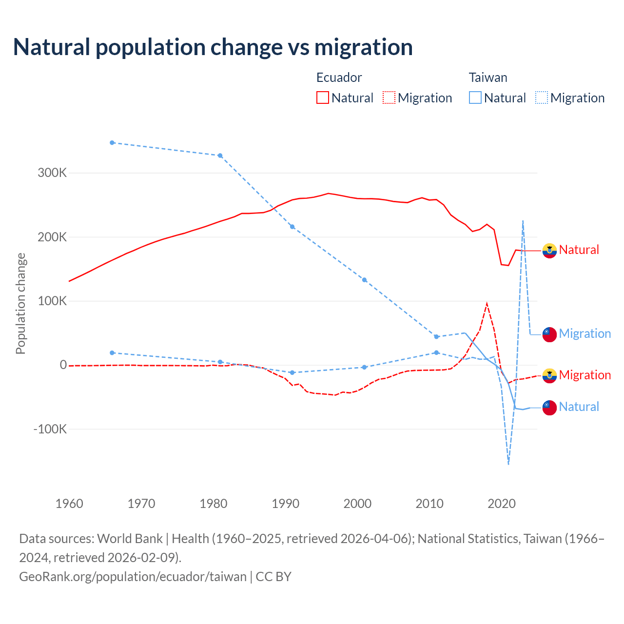 Over the last 10 years, 91.9% of the population change in Ecuador is from natural causes (a gain of 1,964,352 people) and 8.08% is from migration (a gain of 172,707 people). In Taiwan 56.7% is from natural causes (a loss of 57,467 people) and 43.3% is from migration (a gain of 43,884 people).