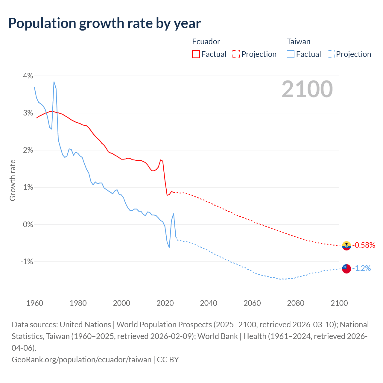 - For the last 10 years, Ecuador has had an average growth rate of +1.26% per year vs -0.03% in Taiwan.