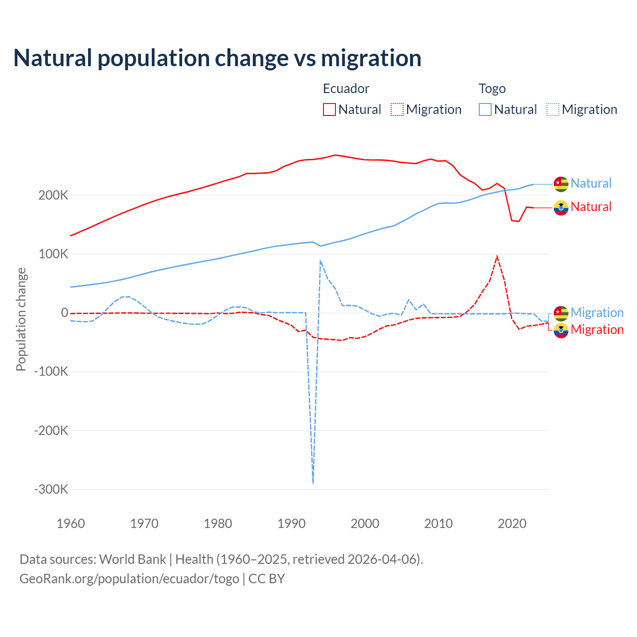 Over the last 10 years, 91.9% of the population change in Ecuador is from natural causes (a gain of 1,964,352 people) and 8.08% is from migration (a gain of 172,707 people). In Togo 99.1% is from natural causes (a gain of 2,052,115 people) and 0.86% is from migration (a loss of 17,852 people).