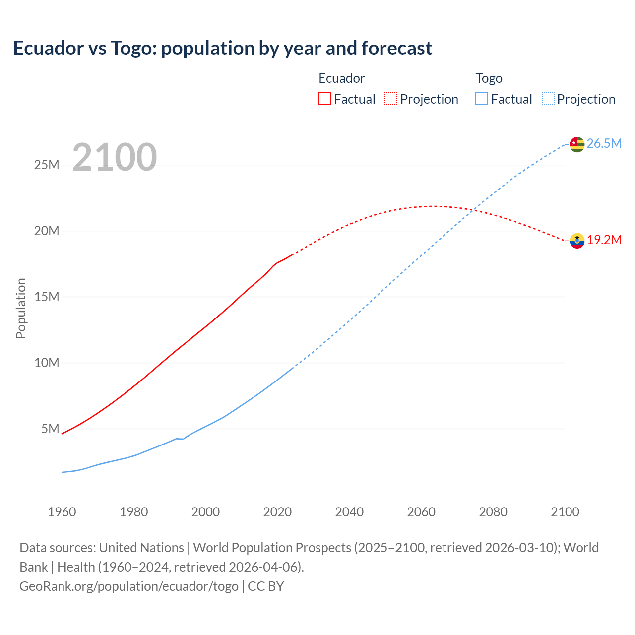 The latest officially reported population of Ecuador was 18,135,478 in 2024 vs 9,515,236 people in Togo in 2024. In 2026, based on the adjusted UN estimation, the current Ecuador's population is 18,487,749 people compared to 9,990,340 in Togo.