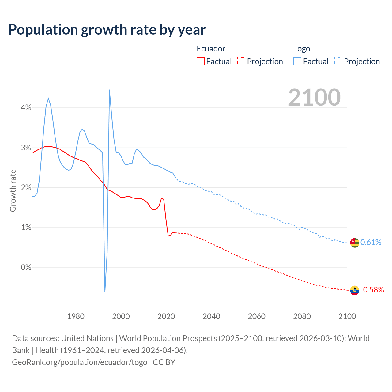- For the last 10 years, Ecuador has had an average growth rate of +1.26% per year vs +2.46% in Togo.